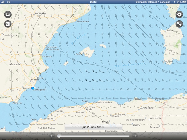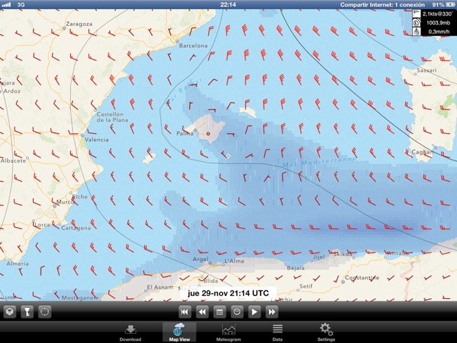 Como fuente de consulta de apoyo tenemos las aplicaciones iGrib y PocketGrib del ipad, pero tenemos que tener en cuenta que estas aplicaciones que son muy buenas y completas nos muestran archivos Grib. Los archivos Grib son datos numéricos y matemáticos hechos por ordenadores o lo que es lo mismo previsiones informáticas sin analizar ni interpretar. Me son validos para consultar a largo plazo las posibles tendencias, tambien son muy utiles en navegación de altura ya que en caso de disponer de conexión de datos via satélite su descarga es rapida y muy poco costosa dada su poca cantidad de datos por ejemplo, todo el mediterraneo para 10 dias pesan 90Kb.